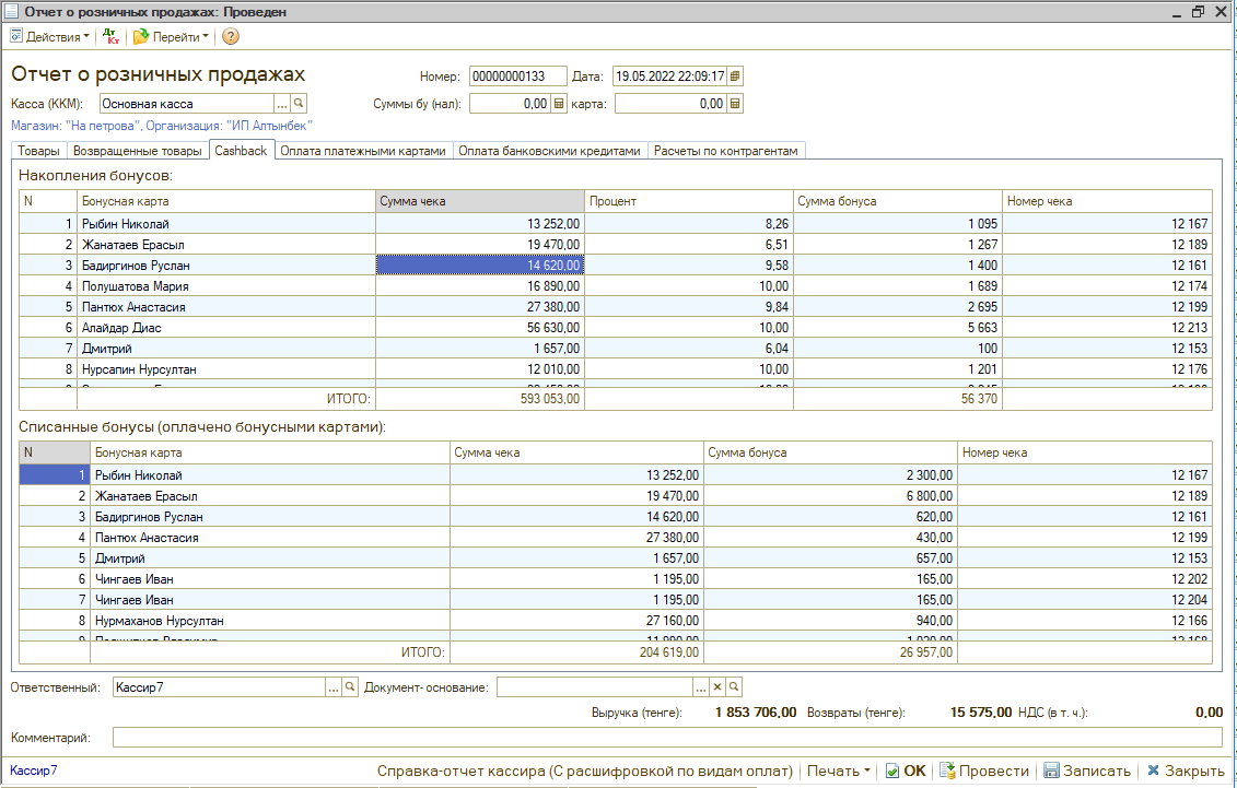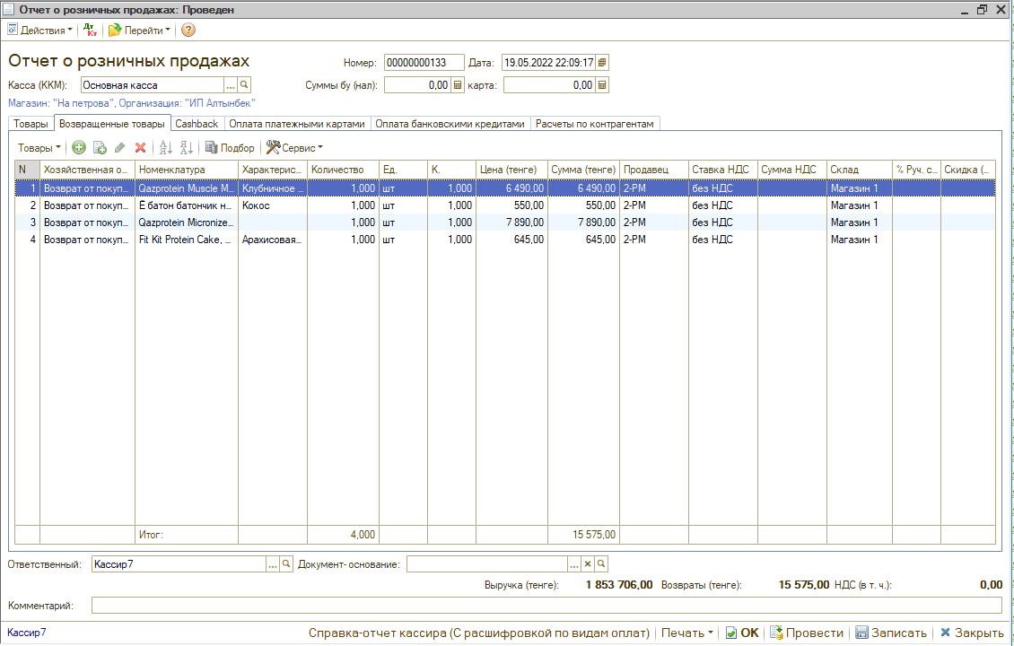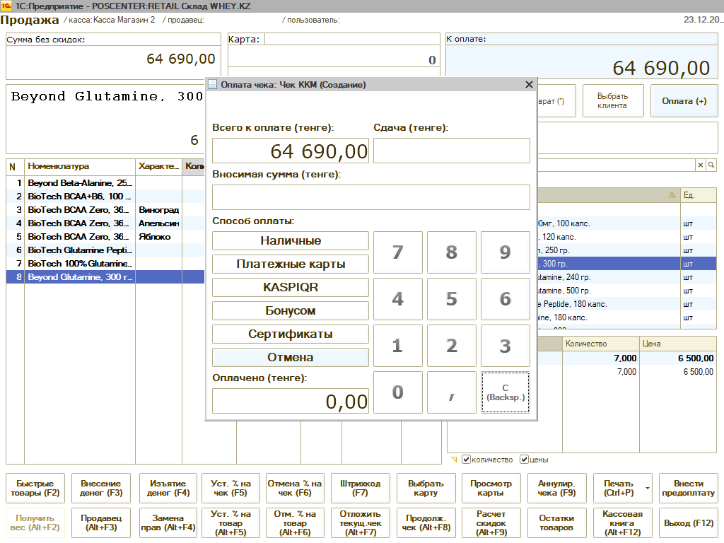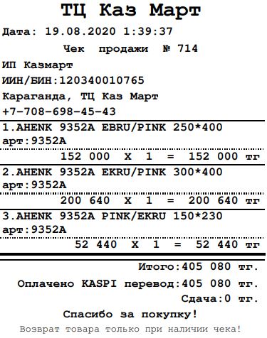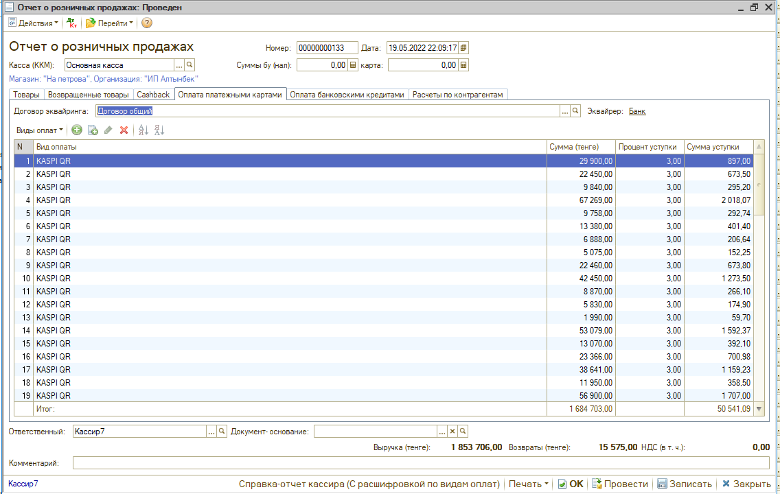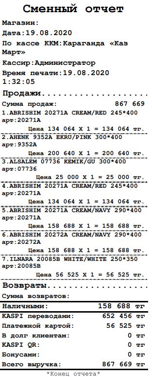 - Учёт оплат KASPI QR, KASPI GOLD, бонусной картой, сертификатом, в долг, банковской картой, кредитной картой.