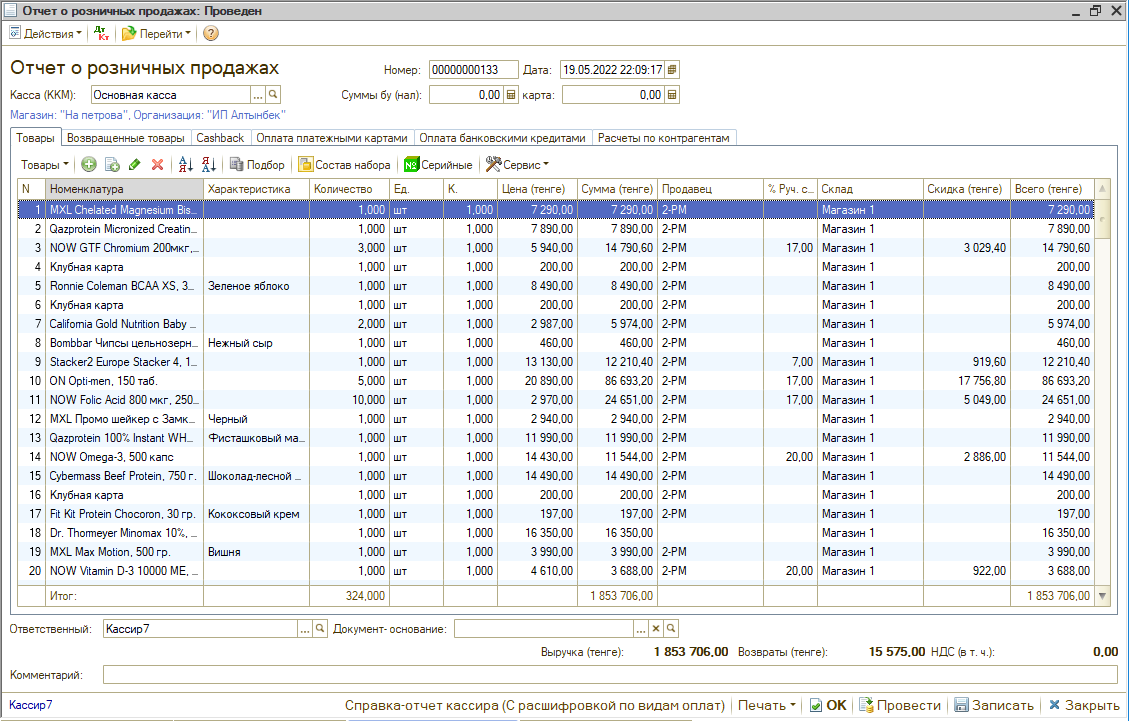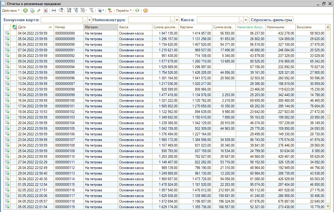- Детальная чековая отчётность (средний чек, минимальный чек, максимальный чек, среднее количество позиций в чеке, максимальное количество позиций, минимальное количество позиций, нагрузка по времени)