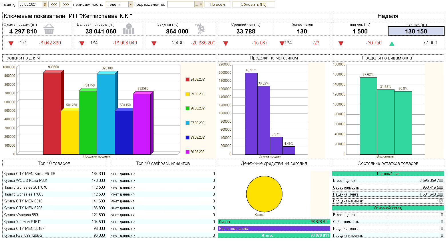 Контролируйте поступление денег и источники доходов. Отражайте все операционные расходы. Начисляйте заработную плату и проценты от продаж. Контролируйте финансово недостачи товаров и пересортицу. Получайте информацию о состоянии кассовой книги ежедневно. В любой момент формируйте отчёт о валовой прибыли.