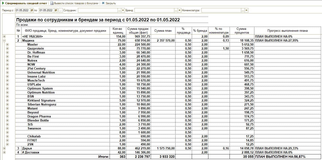 Автоматический расчёт зарплат продавцов оклад + проценты. И увеличенные проценты от конкретных брендов и товаров.
